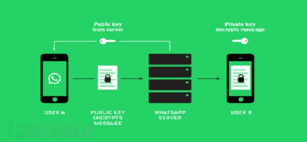 WhatsApp采用端到端加密机制,A给B发消息。A持有的设备用自己的私钥和B所持有设备的公钥来加密信息,B收到信息后再用自己的私钥和A的公钥来解密。WhatsApp服务器上存储有双方协商的公钥,而私钥则是A/B的设备双方在本地生成的。
