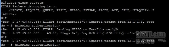 我们发现邻居建立失败的原因就是因为认证不匹配,那么我们继续在R2 R3上配置EIGRP认证