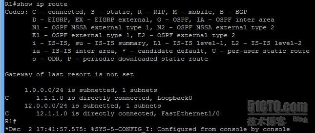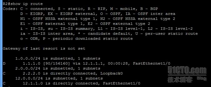 此时R1的EIGRP认证我们就配置成功,此时由于认证原因,R1不能和其他的路由器建立邻居关系,我们查看 R1的路由表