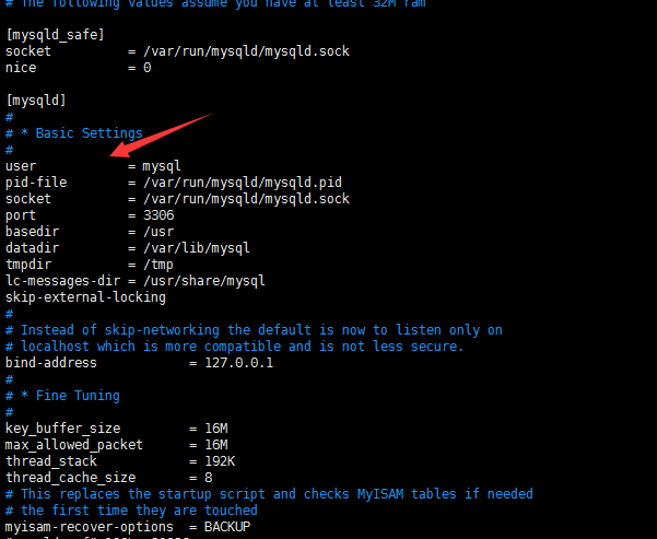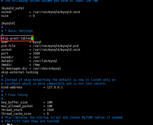 1.找到/etc/mysql/my.cnf 修改此文件添加一行skip-grant-tables(我的在/etc/mysql/mysql.conf.d# vi mysqld.cnf),修改如下图