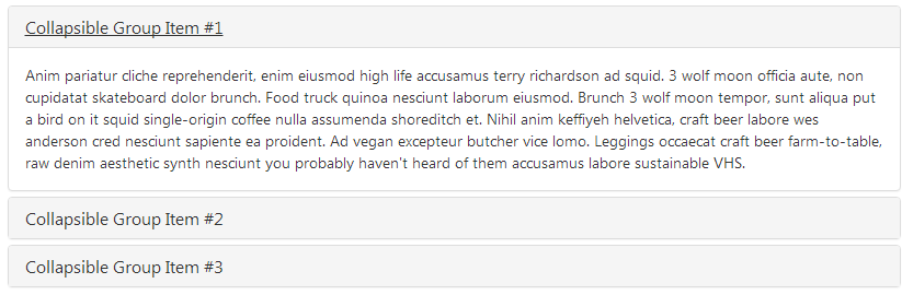 <div class="panel-group" id="accordion" role="tablist" aria-multiselectable="true"> <div class="panel panel-default"> <div class="panel-heading" role="tab" id="headingOne"> <h4 class="panel-title"> <a role="button" data-toggle="collapse" data-parent="#accordion" href="#collapseOne" aria-expanded="true" aria-controls="collapseOne"> Collapsible Group Item #1 </a> </h4> </div> <div id="collapseOne" class="panel-collapse collapse in" role="tabpanel" aria-labelledby="headingOne"> <div class="panel-body"> Anim pariatur cliche reprehenderit, enim eiusmod high life accusamus terry richardson ad squid. 3 wolf moon officia aute, non cupidatat skateboard dolor brunch. Food truck quinoa nesciunt laborum eiusmod. Brunch 3 wolf moon tempor, sunt aliqua put a bird on it squid single-origin coffee nulla assumenda shoreditch et. Nihil anim keffiyeh helvetica, craft beer labore wes anderson cred nesciunt sapiente ea proident. Ad vegan excepteur butcher vice lomo. Leggings occaecat craft beer farm-to-table, raw denim aesthetic synth nesciunt you probably haven't heard of them accusamus labore sustainable VHS. </div> </div> </div> <div class="panel panel-default"> <div class="panel-heading" role="tab" id="headingTwo"> <h4 class="panel-title"> <a class="collapsed" role="button" data-toggle="collapse" data-parent="#accordion" href="#collapseTwo" aria-expanded="false" aria-controls="collapseTwo"> Collapsible Group Item #2 </a> </h4> </div> <div id="collapseTwo" class="panel-collapse collapse" role="tabpanel" aria-labelledby="headingTwo"> <div class="panel-body"> Anim pariatur cliche reprehenderit, enim eiusmod high life accusamus terry richardson ad squid. 3 wolf moon officia aute, non cupidatat skateboard dolor brunch. Food truck quinoa nesciunt laborum eiusmod. Brunch 3 wolf moon tempor, sunt aliqua put a bird on it squid single-origin coffee nulla assumenda shoreditch et. Nihil anim keffiyeh helvetica, craft beer labore wes anderson cred nesciunt sapiente ea proident. Ad vegan excepteur butcher vice lomo. Leggings occaecat craft beer farm-to-table, raw denim aesthetic synth nesciunt you probably haven't heard of them accusamus labore sustainable VHS. </div> </div> </div> <div class="panel panel-default"> <div class="panel-heading" role="tab" id="headingThree"> <h4 class="panel-title"> <a class="collapsed" role="button" data-toggle="collapse" data-parent="#accordion" href="#collapseThree" aria-expanded="false" aria-controls="collapseThree"> Collapsible Group Item #3 </a> </h4> </div> <div id="collapseThree" class="panel-collapse collapse" role="tabpanel" aria-labelledby="headingThree"> <div class="panel-body"> Anim pariatur cliche reprehenderit, enim eiusmod high life accusamus terry richardson ad squid. 3 wolf moon officia aute, non cupidatat skateboard dolor brunch. Food truck quinoa nesciunt laborum eiusmod. Brunch 3 wolf moon tempor, sunt aliqua put a bird on it squid single-origin coffee nulla assumenda shoreditch et. Nihil anim keffiyeh helvetica, craft beer labore wes anderson cred nesciunt sapiente ea proident. Ad vegan excepteur butcher vice lomo. Leggings occaecat craft beer farm-to-table, raw denim aesthetic synth nesciunt you probably haven't heard of them accusamus labore sustainable VHS. </div> </div> </div> </div>