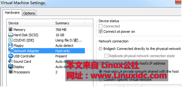 首先,介绍如何在VMWARE中设置Linux的网络。一般网络选项有Bridged, NAT, host-only几种。本次以我实现的host-only为样本来做详细说明,如下图:
