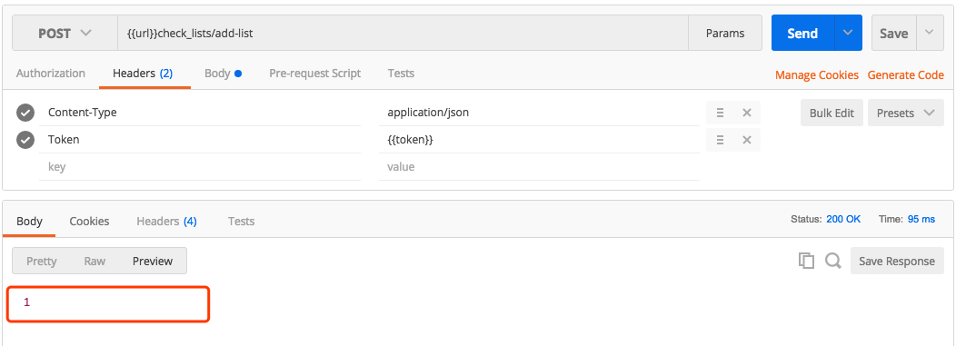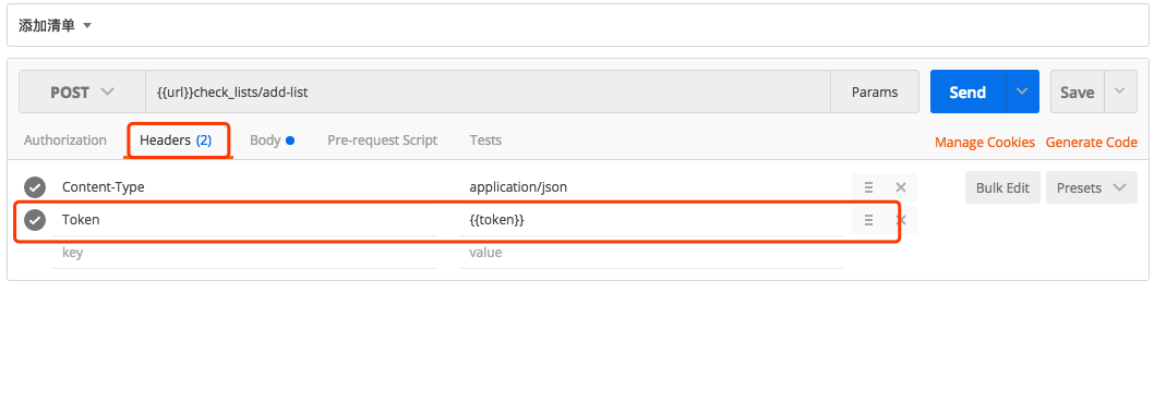 然后在api请求的url 的head头部添加对应的token键名,value值用花括号{{token}}包住,就会自动获取其值。