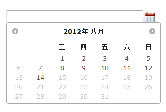var getCurrDate=""; $( "#datepicker" ).datepicker({ regional:"zh-CN", //设置中文 duration:"", //效果无 showAnim:"", //效果无 firstDay: 1, //从星期一开始 minDate: +1, //设置可用最小值 +1 表示从今天加上一天 maxDate:+14, //设置可用最大值 +14 表示从今天加上十四天 showOn: "both", //设置input和img都可用 buttonImage:"/calendar_icon.jpg", //设置自定义图片按钮 buttonImageOnly: true, //设置将图片作为按钮触发