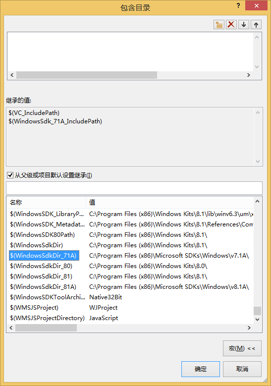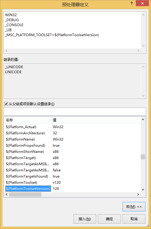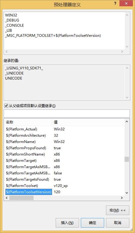环境变量宏:对于xp版平台工具集,“继承的值”中会多一项“_USING_V110_SDK71_”。