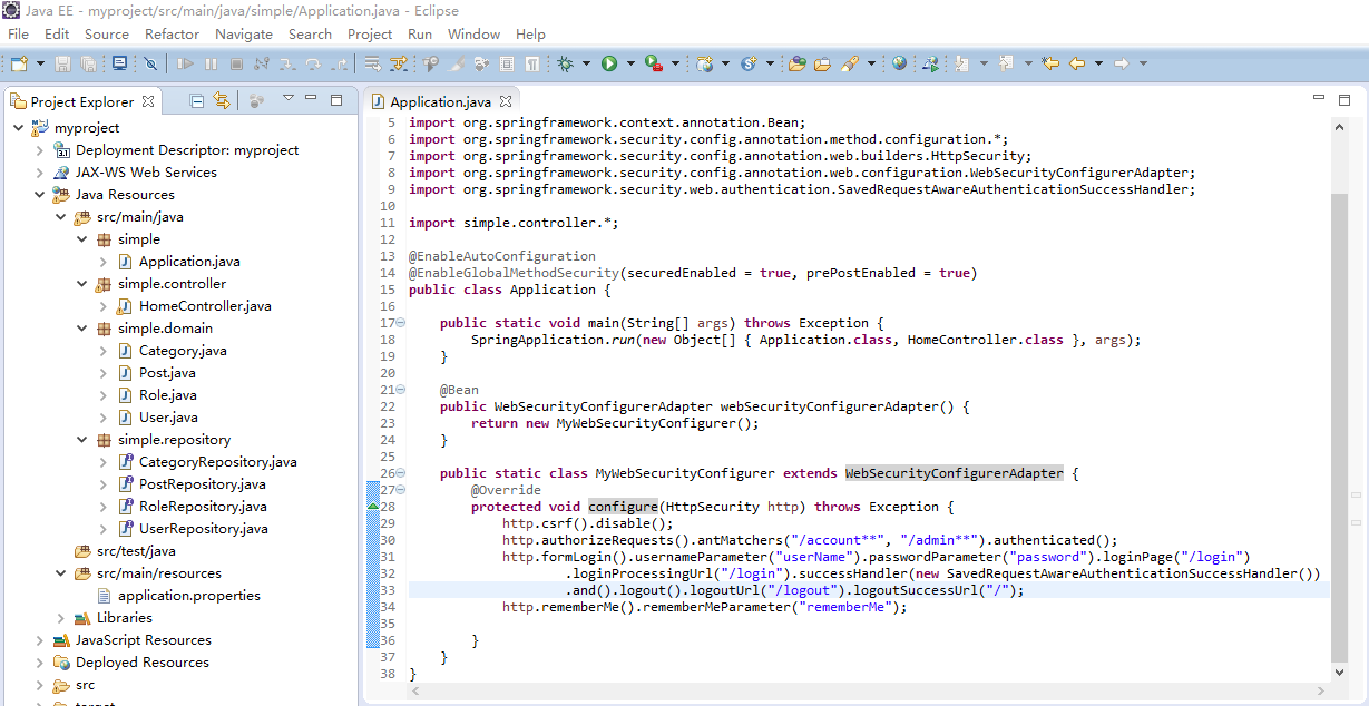 1 package simple; 2 3 import org.springframework.boot.*; 4 import org.springframework.boot.autoconfigure.*; 5 import org.springframework.context.annotation.Bean; 6 import org.springframework.security.config.annotation.method.configuration.*; 7 import org.springframework.security.config.annotation.web.builders.HttpSecurity; 8 import org.springframework.security.config.annotation.web.configuration.WebSecurityConfigurerAdapter; 9 import org.springframework.security.web.authentication.SavedRequestAwareAuthenticationSuccessHandler; 10 11 import simple.controller.*; 12 13 @EnableAutoConfiguration 14 @EnableGlobalMethodSecurity(securedEnabled = true, prePostEnabled = true) 15 public class Application { 16 17 public static void main(String[] args) throws Exception { 18 SpringApplication.run(new Object[] { Application.class, HomeController.class }, args); 19 } 20 21 @Bean 22 public WebSecurityConfigurerAdapter webSecurityConfigurerAdapter() { 23 return new MyWebSecurityConfigurer(); 24 } 25 26 public static class MyWebSecurityConfigurer extends WebSecurityConfigurerAdapter { 27 @Override 28 protected void configure(HttpSecurity http) throws Exception { 29 http.csrf().disable(); 30 http.authorizeRequests().antMatchers("/account**", "/admin**").authenticated(); 31 http.formLogin().usernameParameter("userName").passwordParameter("password").loginPage("/login") 32 .loginProcessingUrl("/login").successHandler(new SavedRequestAwareAuthenticationSuccessHandler()) 33 .and().logout().logoutUrl("/logout").logoutSuccessUrl("/"); 34 http.rememberMe().rememberMeParameter("rememberMe"); 35 36 } 37 } 38 }