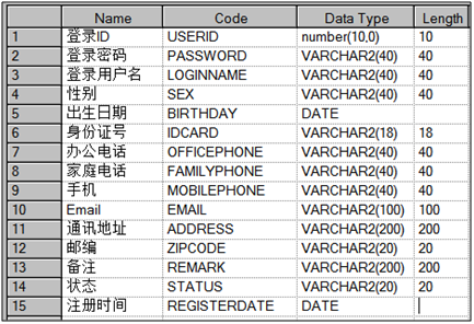 SELECT USERID,PASSWORD,LOGINNAME,SEX,BIRTHDAY,IDCARD,OFFICEPHONE,FAMILYPHONE,MOBILEPHONE,EMAIL,ADDRESS,ZIPCODE,REMARK,STATUS,REGISTERDATE