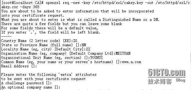 证书签署请求里面的选项除了common name一项填写自己的网站外,其余的必须与CA签发机构一致