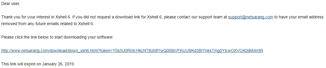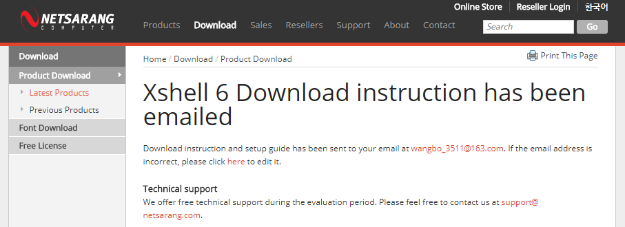 意思是:Xshell 6下载说明已通过电子邮件发送。接着你可以到你的邮箱去看邮件,邮件里有相应的下载地址。