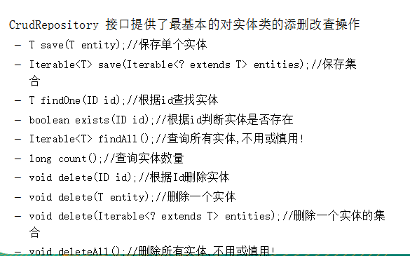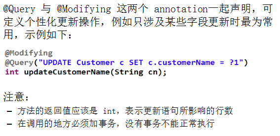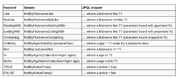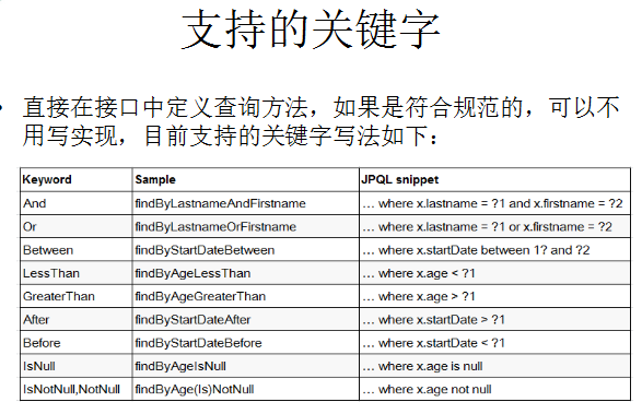 1 package com.atguigu.springdata; 2 3 import java.util.Date; 4 import java.util.List; 5 6 import org.springframework.data.jpa.repository.JpaRepository; 7 import org.springframework.data.jpa.repository.JpaSpecificationExecutor; 8 import org.springframework.data.jpa.repository.Modifying; 9 import org.springframework.data.jpa.repository.Query; 10 import org.springframework.data.repository.query.Param; 11 12 /** 13 * 1. Repository 是一个空接口. 即是一个标记接口 14 * 2. 若我们定义的接口继承了 Repository, 则该接口会被 IOC 容器识别为一个 Repository Bean. 15 * 纳入到 IOC 容器中. 进而可以在该接口中定义满足一定规范的方法. 16 * 17 * 3. 实际上, 也可以通过 @RepositoryDefinition 注解来替代继承 Repository 接口 18 */ 19 /** 20 * 在 Repository 子接口中声明方法 21 * 1. 不是随便声明的. 而需要符合一定的规范 22 * 2. 查询方法以 find | read | get 开头 23 * 3. 涉及条件查询时,条件的属性用条件关键字连接 24 * 4. 要注意的是:条件属性以首字母大写。 25 * 5. 支持属性的级联查询. 若当前类有符合条件的属性, 则优先使用, 而不使用级联属性. 26 * 若需要使用级联属性, 则属性之间使用 _ 进行连接. 27 */ 28 //@RepositoryDefinition(domainClass=Person.class,idClass=Integer.class) 29 public interface PersonRepsotory extends 30 JpaRepository<Person, Integer>, 31 JpaSpecificationExecutor<Person>, PersonDao{ 32 33 //根据 lastName 来获取对应的 Person 34 Person getByLastName(String lastName); 35 36 //WHERE lastName LIKE ?% AND id < ? 37 List<Person> getByLastNameStartingWithAndIdLessThan(String lastName, Integer id); 38 39 //WHERE lastName LIKE %? AND id < ? 40 List<Person> getByLastNameEndingWithAndIdLessThan(String lastName, Integer id); 41 42 //WHERE email IN (?, ?, ?) OR birth < ? 43 List<Person> getByEmailInAndBirthLessThan(List<String> emails, Date birth); 44 45 //WHERE a.id > ? 46 List<Person> getByAddress_IdGreaterThan(Integer id); 47 48 //查询 id 值最大的那个 Person 49 //使用 @Query 注解可以自定义 JPQL 语句以实现更灵活的查询 50 @Query("SELECT p FROM Person p WHERE p.id = (SELECT max(p2.id) FROM Person p2)") 51 Person getMaxIdPerson(); 52 53 //为 @Query 注解传递参数的方式1: 使用占位符. 54 @Query("SELECT p FROM Person p WHERE p.lastName = ?1 AND p.email = ?2") 55 List<Person> testQueryAnnotationParams1(String lastName, String email); 56 57 //为 @Query 注解传递参数的方式1: 命名参数的方式. 58 @Query("SELECT p FROM Person p WHERE p.lastName = :lastName AND p.email = :email") 59 List<Person> testQueryAnnotationParams2(@Param("email") String email, @Param("lastName") String lastName); 60 61 //SpringData 允许在占位符上添加 %%. 62 @Query("SELECT p FROM Person p WHERE p.lastName LIKE %?1% OR p.email LIKE %?2%") 63 List<Person> testQueryAnnotationLikeParam(String lastName, String email); 64 65 //SpringData 允许在占位符上添加 %%. 66 @Query("SELECT p FROM Person p WHERE p.lastName LIKE %:lastName% OR p.email LIKE %:email%") 67 List<Person> testQueryAnnotationLikeParam2(@Param("email") String email, @Param("lastName") String lastName); 68 69 //设置 nativeQuery=true 即可以使用原生的 SQL 查询 70 @Query(value="SELECT count(id) FROM jpa_persons", nativeQuery=true) 71 long getTotalCount(); 72 73 //可以通过自定义的 JPQL 完成 UPDATE 和 DELETE 操作. 注意: JPQL 不支持使用 INSERT 74 //在 @Query 注解中编写 JPQL 语句, 但必须使用 @Modifying 进行修饰. 以通知 SpringData, 这是一个 UPDATE 或 DELETE 操作 75 //UPDATE 或 DELETE 操作需要使用事务, 此时需要定义 Service 层. 在 Service 层的方法上添加事务操作. 76 //默认情况下, SpringData 的每个方法上有事务, 但都是一个只读事务. 他们不能完成修改操作! 77 @Modifying 78 @Query("UPDATE Person p SET p.email = :email WHERE id = :id") 79 void updatePersonEmail(@Param("id") Integer id, @Param("email") String email); 80 } 81