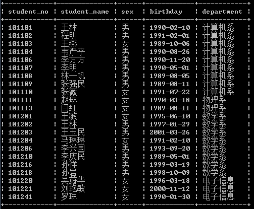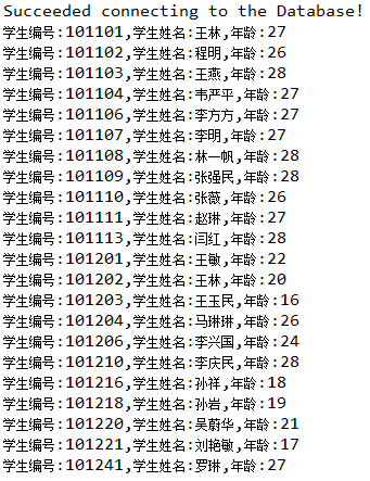 package com.oracle.zibo; import java.sql.Connection; import java.sql.DriverManager; import java.sql.PreparedStatement; import java.sql.ResultSet; import java.util.Calendar; public class Demo1 { public static final String url="jdbc:mysql://127.0.0.1:3306/stu"; //URL指向要访问的数据库名 public static final String name="com.mysql.jdbc.Driver";//驱动程序名 public static final String user="root";//MySQL配置时的用户名 public static final String password="123456";//MySQL配置时的密码 public static void main(String[] args) { //遍历查询结果集 try{ Class.forName(name);//加载驱动程序 //1.getConnection()方法,连接MySQL数据库!! Connection conn=DriverManager.getConnection(url, user, password); if(!conn.isClosed()) System.out.println("Succeeded connecting to the Database!"); //2.要执行的SQL语句 String sql="select student_no,student_name,birthday from student"; //创建statement类对象,用来执行SQL语句!! PreparedStatement pst=conn.prepareStatement(sql); //3.ResultSet类,用来存放获取的结果集!! ResultSet resultSet=pst.executeQuery(); while(resultSet.next()){ //获取student_no这列数据 String studentNo=resultSet.getString("student_no"); //获取student_name这列数据 String studentName=resultSet.getString("student_name"); //此处导入Calendar类用来计算学生的年龄 int year=Calendar.getInstance().getTime().getYear(); int age=year-resultSet.getDate("birthday").getYear(); //输出结果 System.out.println("学生编号"+studentNo+",学生姓名:"+studentName+",年龄:"+age); } pst.close(); conn.close(); //处理异常 }catch(Exception e){ e.printStackTrace(); } } }