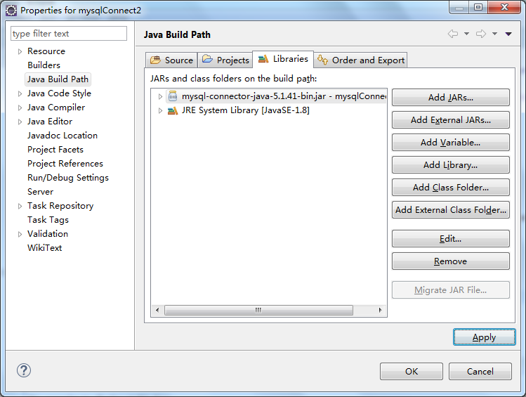 2. 右键工程名,在java build path中的Libraries分页中选择Add JARs...,选择刚才添加的JDBC,如下图: