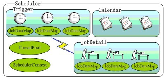 Scheduler可以将Trigger绑定到某一JobDetail中, 这样当Trigger触发时, 对应的Job就被执行。一个Job可以对应多个Trigger, 但一个Trigger只能对应一个Job。可以通过SchedulerFactory创建一个Scheduler实例。Scheduler拥有一个SchedulerContext,它类似于ServletContext,保存着Scheduler上下文信息,Job和Trigger都可以访问SchedulerContext内的信息。SchedulerContext内部通过一个Map,以键值对的方式维护这些上下文数据,SchedulerContext为保存和获取数据提供了多个put()和getXxx()的方法。可以通过Scheduler# getContext()获取对应的SchedulerContext实例;