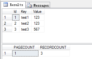 declare @pageIndex int; set @pageIndex=1; declare @pageSize int; set @pageSize=5; declare @filter xml; set @filter='<filter><rule column="key" match="test3" required="1"/><rule column="value" match="123" required="0"/></filter>' declare @pageCount int; declare @recordCount int; exec dbo.sp_r_fp_configuration @pageIndex,@pageSize,@filter,@pageCount=@pageCount OUTPUT, @recordCount=@recordCount OUTPUT select @pageCount as [PAGECOUNT], @recordCount as [RECORDCOUNT]