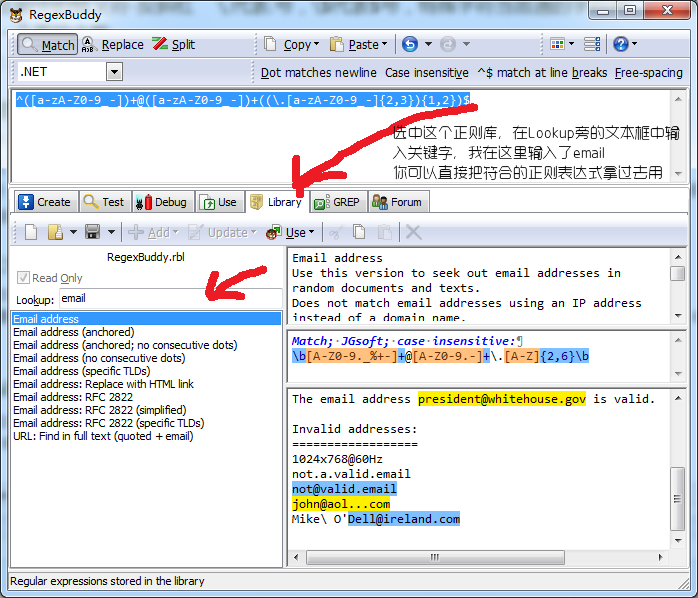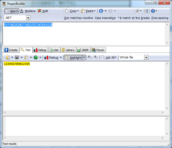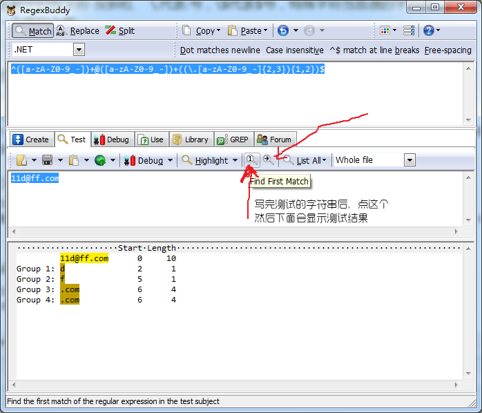 (你先在上面一个框写好正确的正则表达式,然后勾选它上面的下拉框为.NET,然后选中Test 选项卡,在下面写字符串,写好后,当你的字符串背景呈现黄色,说明该字符串就符合了上面表达式的要求了,否则无色)