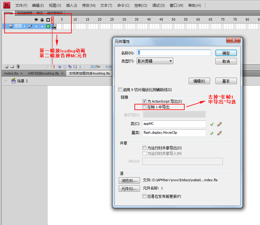 AS3.0文档类加载自身loading进度时会出现直接显示100%的问题,用这个“双帧法”(制作loading最少要两帧,),只需要三个步骤可以解决这个问题: