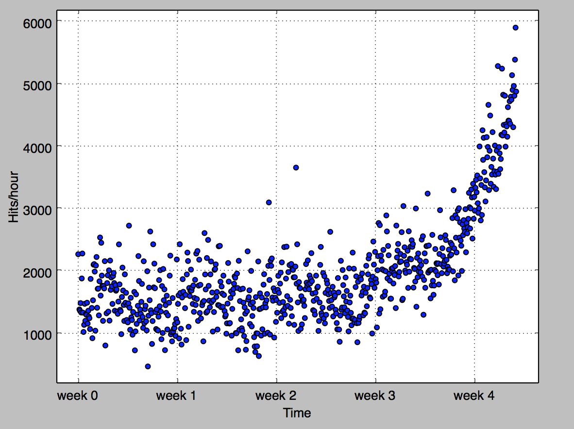 # 清理无效数据 x = x[~sp.isnan(y)] y = y[~sp.isnan(y)] # 散点坐标图 plt.scatter(x, y) # x坐标 plt.xlabel('Time') plt.ylabel('Hits/hour') # tick 标记号于 plt.xticks([w*7*24 for w in range(10)], ['week %i'%w for w in range(10)]) # 自动测量/规模 tight=紧 plt.autoscale(tight=True) # 开启网格 plt.grid() # 显示图表 plt.show()