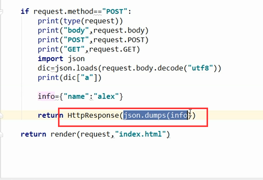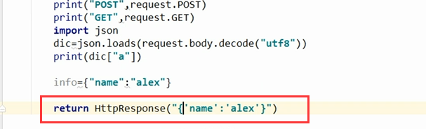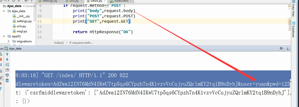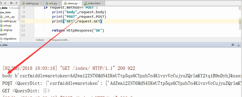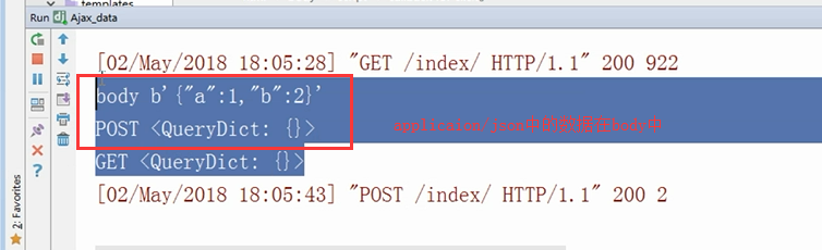 我们看到,当前端使用json去发送数据,虽然使用的是post的方式,但是在request.POST中没有数据,数据在request.body中,这个数据我们看到是bytes格式的数据,我们先要要用decode解码出来,然后在json.loads把数据取出来