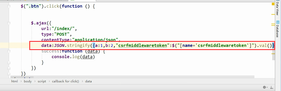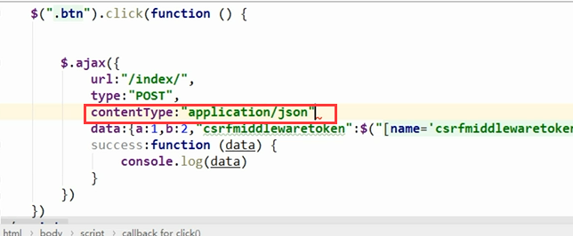 我们看下代码,重点还是看下contentType和data数据,因为我们这次是要发送json格式的数据,那么必须要用JSON.stringify对数据进行处理,然后才能发送到后端