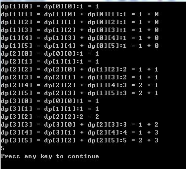 */ int dp[100][100];//全局,默认初始化为0 int n,m; int main() { m=5;n=3; int i,j; //全局变量默认初始化为0可以无需初始化了。 // for (j=0;j<m;j++)//苹果 // { // dp[0][j]=0; // } //可以再拆分,也无需初始化。 // for (i=0;i<n;i++)//篮子 // { // dp[i][0]=1; // } dp[0][0] = 1; for(i = 1; i <= n; ++i)//篮子 for( j =0; j <= m; ++j)//苹果 { if(j>=i) { dp[i][j] = dp[i][j-i] + dp[i-1][j]; cout<<"dp["<<i<<"]["<<j<<"] = dp["<<i<<"]["<<j-i<<"] + dp["<<i-1<<"]["<<j<<"]"; cout<<":"<<dp[i][j]<<" = "<<dp[i][j-i]<<" + "<<dp[i-1][j]; } else { dp[i][j] = dp[j][j]; cout<<"dp["<<i<<"]["<<j<<"] = dp["<<j<<"]["<<j<<"]"; cout<<":"<<dp[i][j]<<" = "<<dp[j][j]; } cout<<endl; } cout<<dp[n][m]<<endl; //} return 0; } #endif //递归求解
