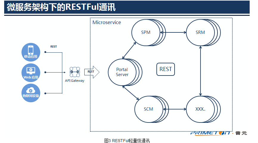 RESTFul:轻量级通讯的首选方式。在微服务架构下,推崇采用轻量级的方式进行通讯,我们选择RESTFul进行通讯,每个微服务都统一对外暴露RESTFul服务,无论是前端调用后端服务,还是后端服务间的调用,都统一走RESTFul,这样统一了协议栈;同时还可以非常方便的进行服务的mock,只需要模拟RESTFul请求就可以了,服务间依赖测试难度大大降低,极大的提高了开发人员开发微服务、测试人员测试微服务、集成微服务的效率。依赖于轻量级的RESTFul,在微服务架构中,引入非java语言也是可行的。以下是我们微服务架构中RESTFul通讯的示意图: