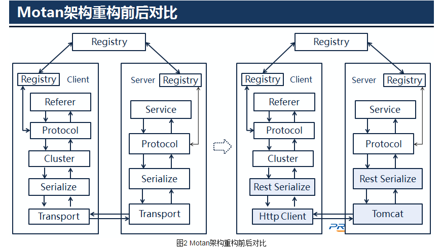 当然,将二进制数据改成json后,性能会有损耗,但是性能并不是我们追求的唯一目标,我们系统并不直接面向用户,更多的是企业用户,所以开发效率,研发成本等问题考虑多一些。以下是我们改造前后motan架构对比: