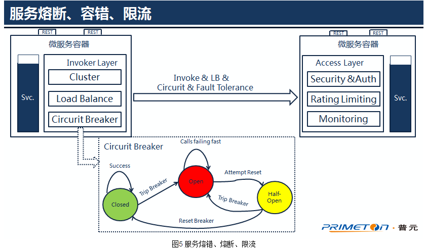 负载均衡和容错:服务高可用的重要手段。为了保证微服务的高可用,每个微服务一般会有多个实例服务提供服务,此时需要客户端在进行服务的负载均衡;目前微服务框架中,现支持常见的负载均衡策略,如随机,轮训,hash,权重,连接数,缺省是根据连接数,连接数越少,优先级越高。在调用服务集群的时候,如果一个微服务调用异常,如超时,或者发生连接异常,网络异常,则根据容错策略进行服务容错,目前我们采用简单的Failover,即选择下一个可用的服务进行调用,目前支持的容错策略有快速失败、失效切换。如果连续失败多次,则需要直接熔断,不再发起调用,这样可以防止一个服务异常拖垮所有依赖它的服务;在熔断这个地方,目前我们做的比较简单,采用简单的策略避免服务不可用,后续会考虑将Netflix 的Hystrix引入到我们的微服务框架中。