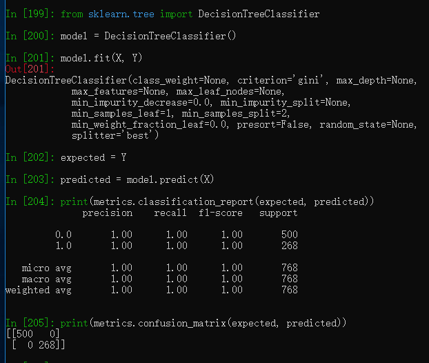 from sklearn import metrics from sklearn.tree import DecisionTreeClassifier model = DecisionTreeClassifier() model.fit(X, Y) print(model) expected = Y predicted = model.predict(X) print(metrics.classification_report(expected, predicted)) print(metrics.confusion_matrix(expected, predicted))