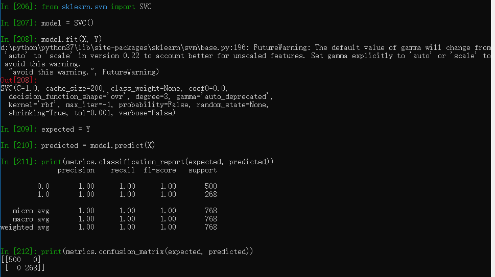 from sklearn import metrics from sklearn.svm import SVC model = SVC() model.fit(X, Y) print(model) expected = Y predicted = model.predict(X) print(metrics.classification_report(expected, predicted)) print(metrics.confusion_matrix(expected, predicted))