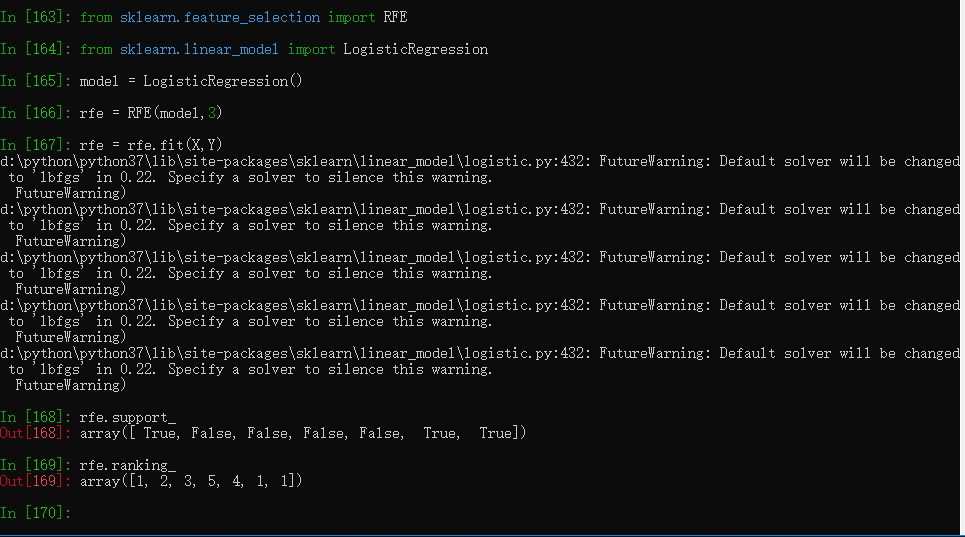 from sklearn.feature_selection import RFE from sklearn.linear_model import LogisticRegression model = LogisticRegression() # create the RFE model and select 3 attributes rfe = RFE(model, 3) rfe = rfe.fit(X, Y) # summarize the selection of the attributes print(rfe.support_) print(rfe.ranking_)