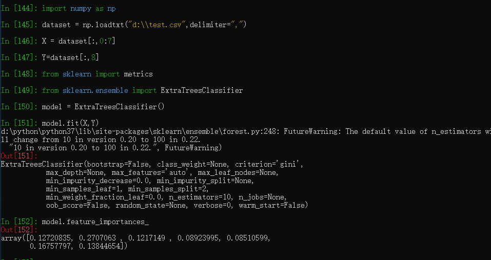 from sklearn import metrics from sklearn.ensemble import ExtraTreesClassifier model = ExtraTreesClassifier() model.fit(X, y) # display the relative importance of each attribute print(model.feature_importances_)