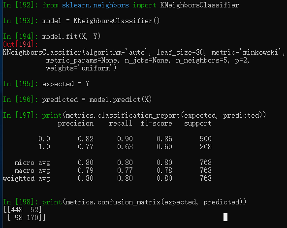 from sklearn import metrics from sklearn.neighbors import KNeighborsClassifier model = KNeighborsClassifier() model.fit(X, Y) print(model) expected = Y predicted = model.predict(X) print(metrics.classification_report(expected, predicted)) print(metrics.confusion_matrix(expected, predicted))
