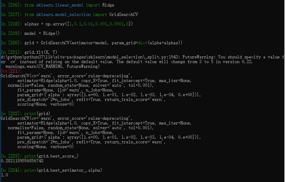 import numpy as np from sklearn.linear_model import Ridge from sklearn.model_selection import GridSearchCV alphas = np.array([1,0.1,0.01,0.001,0.0001,0]) model = Ridge() grid = GridSearchCV(estimator=model, param_grid=dict(alpha=alphas)) grid.fit(X, Y) print(grid) print(grid.best_score_) print(grid.best_estimator_.alpha)