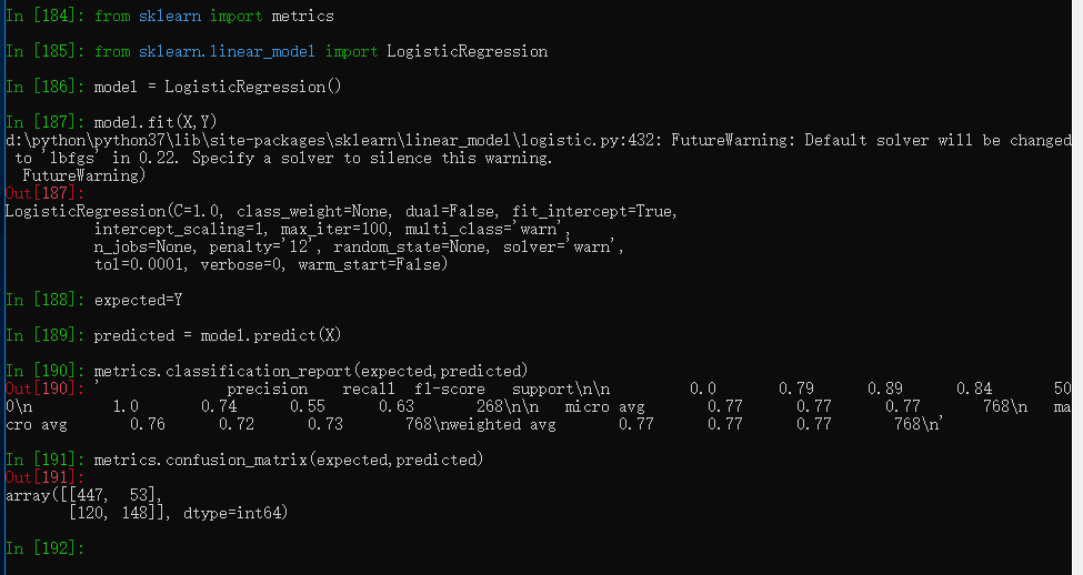 from sklearn import metrics from sklearn.linear_model import LogisticRegression model = LogisticRegression() model.fit(X, Y) print(model) # make predictions expected = Y predicted = model.predict(X) # summarize the fit of the model print(metrics.classification_report(expected, predicted)) print(metrics.confusion_matrix(expected, predicted))