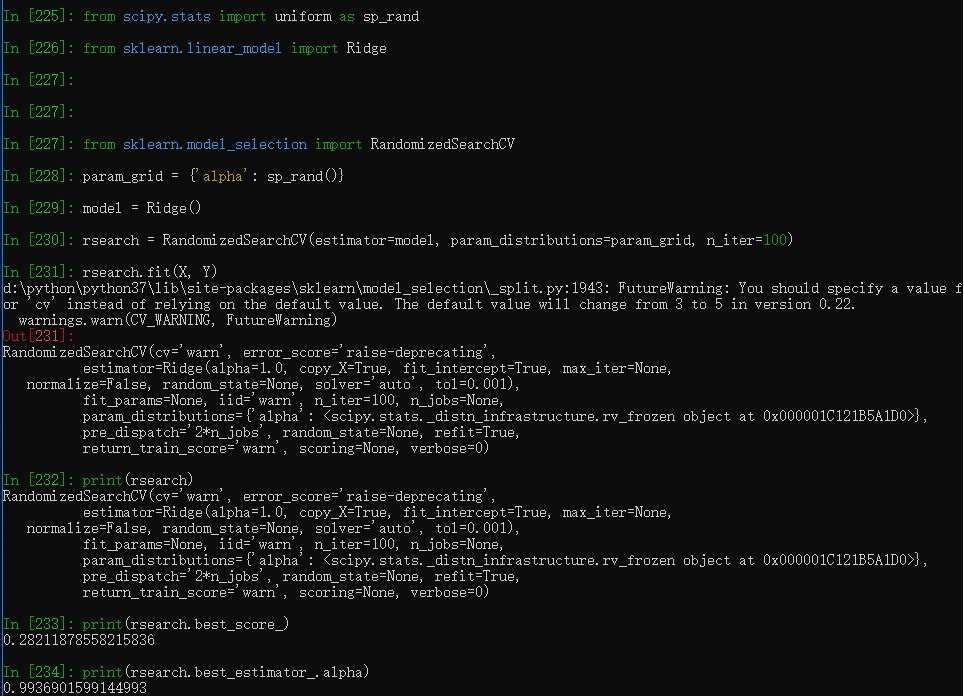 import numpy as np from scipy.stats import uniform as sp_rand from sklearn.linear_model import Ridge from sklearn.model_selection import RandomizedSearchCV param_grid = {'alpha': sp_rand()} model = Ridge() rsearch = RandomizedSearchCV(estimator=model, param_distributions=param_grid, n_iter=100) rsearch.fit(X, Y) print(rsearch) print(rsearch.best_score_) print(rsearch.best_estimator_.alpha)