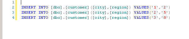 INSERT INTO [dbo].[customer]([city],[region]) VALUES('1','2')