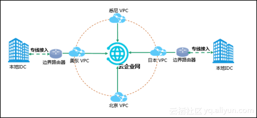 云企业网实现加载其中的网络实例全互连,网络实例包含VPC和VBR。