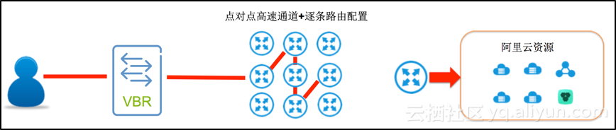 在引入云企业网之前,用户IDC通过POP点接入阿里云,想与云上资源进行跨地域互通,需借助高速通道等网络产品,实现私网互连。如果两地域之间没有直连高速通道,用户需要购买多条高速通道,并通过多次路由配置及中转方式,才能达到互通目的。无论在使用及路由管理方面,都带来很多不便。