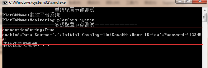 Console.WriteLine("---------------------多级配置节点测试-----------------"); Console.WriteLine("connectionString:" + CustomerMultiConfig.GetConfig().CustomerElementConfig.Enabled); Console.WriteLine("enabled:" + CustomerMultiConfig.GetConfig().CustomerElementConfig.ConnectionString);