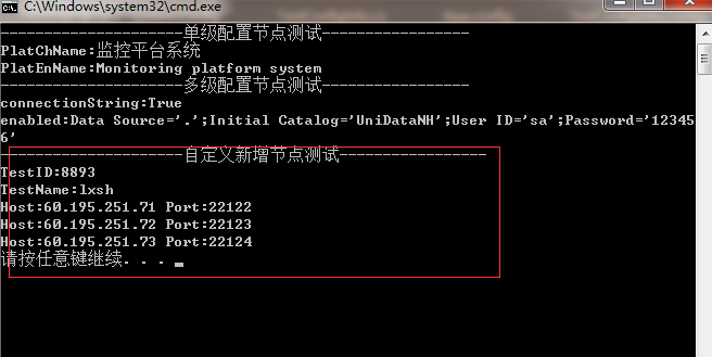 Console.WriteLine("---------------------自定义新增节点测试-----------------"); Console.WriteLine("TestID:" + TestConfigInfo.GetConfig().TestID); Console.WriteLine("TestName:" + TestConfigInfo.GetConfig().TestName); foreach (tracker item in TestConfigInfo.GetConfig().Trackers) { Console.WriteLine("Host:" + item.Host + " Port:" + item.Port); }