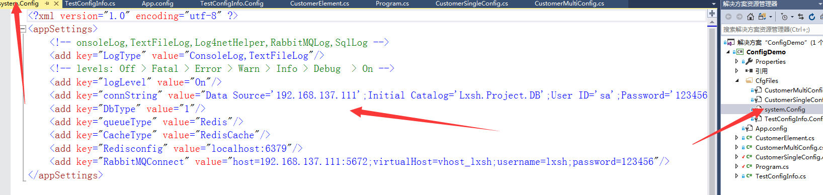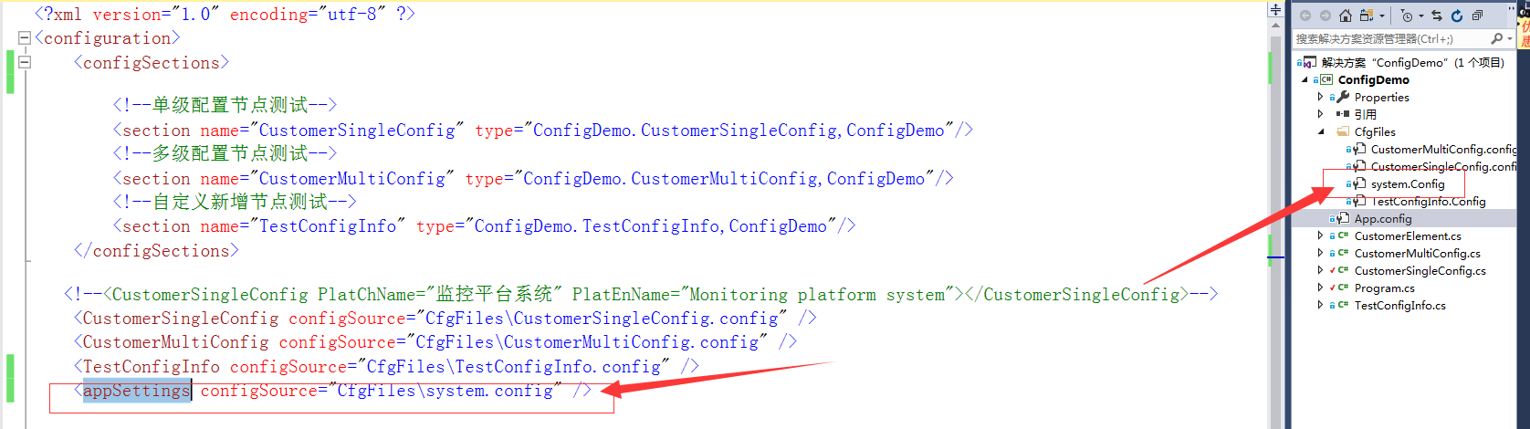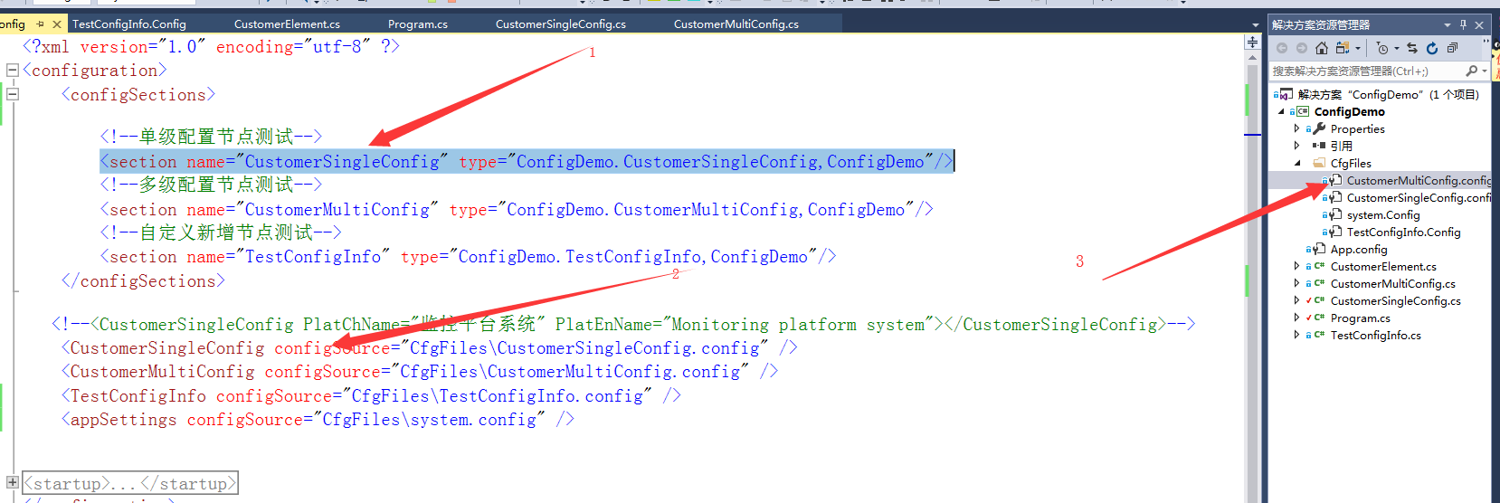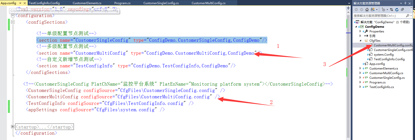 将1.3 <section name="CustomerSingleConfig" type="ConfigDemo.CustomerSingleConfig,ConfigDemo"/>这个节点内容换成如下配置: