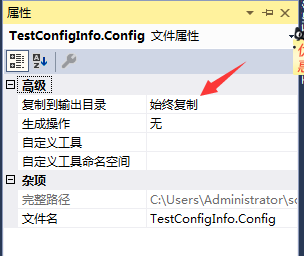 3.3 右键TestConfigInfo.Config属性,选择输出目录为始终复制,这样操作目地是在运行目录下面生成该文件(其他配置文件也需要这样操作)