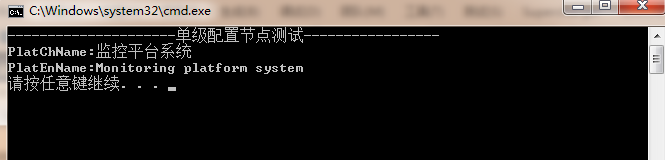 static void Main(string[] args) { Console.WriteLine("---------------------单级配置节点测试-----------------"); Console.WriteLine("PlatChName:" + CustomerSingleConfig.GetConfig().PlatChName); Console.WriteLine("PlatEnName:" + CustomerSingleConfig.GetConfig().PlatEnName); }