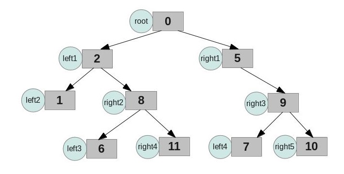 1 #include<iostream> 2 using namespace std; 3 4 typedef struct binTree{ 5 int data; 6 struct binTree* left; 7 struct binTree* right; 8 }BinNode, *BinTree; 9 10 /* 11 * root 12 * left1 right1 13 * left2 right2 right3 14 * left3 right4 left4 right5 15 */ 16 17 void createBinTree(BinTree& root){ 18 BinTree left1 = new BinNode; 19 BinTree right1 = new BinNode; 20 left1->data = 2; 21 right1->data = 5; 22 root->left = left1; 23 root->right = right1; //Construct the first layer. 24 25 BinTree left2 = new BinNode; 26 BinTree right2 = new BinNode; 27 left2->data = 1; 28 right2->data = 8; 29 left1->left = left2; 30 left1->right = right2; 31 BinTree right3 = new BinNode; 32 right3->data = 9; 33 right1->right = right3; //Construct the second layer 34 35 BinTree left3 = new BinNode; 36 left3->data = 6; 37 right2->left = left3; 38 BinTree right4 = new BinNode; 39 right4->data = 11; 40 right2->right = right4; 41 42 BinTree left4 = new BinNode; 43 left4->data = 7; 44 right3->left = left4; 45 BinTree right5 = new BinNode; 46 right5->data = 10; 47 right3->right = right5; 48 } 49 50 int main(void){ 51 BinTree root = new BinNode; 52 root->data = 0; 53 createBinTree(root); 54 return 0; 55 }