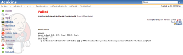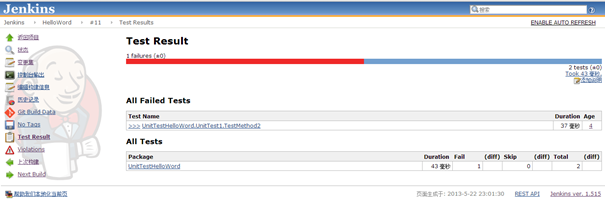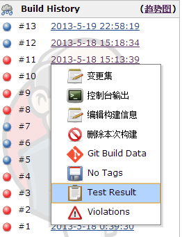 对于每次的测试,都有很详细的信息展示。要查看某一次构建的测试结果,可以点击构建历史中的测试结果。