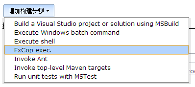 为了能让FxCop在构建系统时运行,还需在任务中添加配置。在构建项目,选择增加构建步骤,选择FxCop exec。