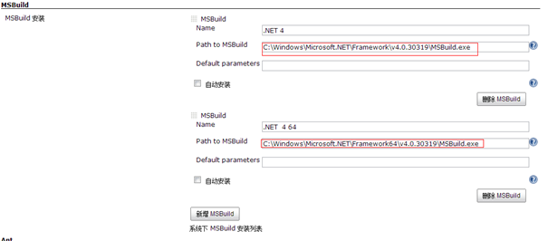 点击MSBuild安装,添加MSBuild的配置,如下图,分别添加了.NET FrameWork 4.0 32位和64位MSBuild.exe,在创建任务选择用MSBuild构建时,将同时用32、64位的MSBuild.exe去编译。