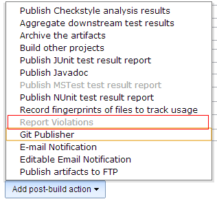 在任务配置页面,构建后操作,增加构建后操作,选择Report Violations。