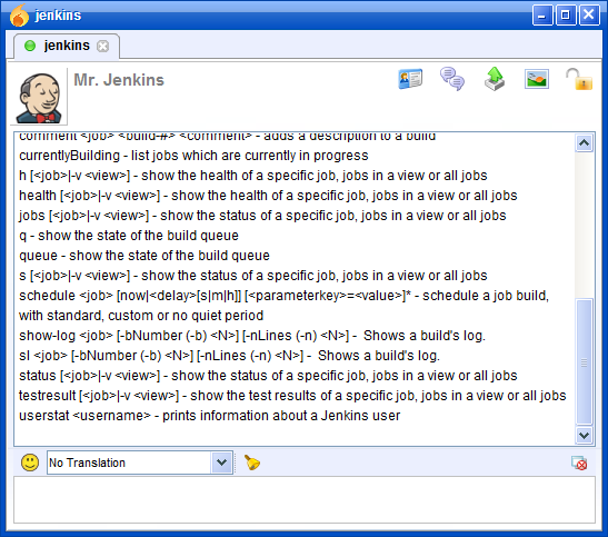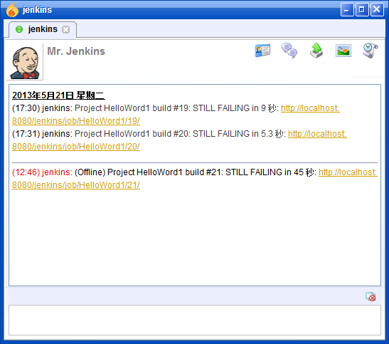 完成配置后,开发人员可通过Jabber客户端与Jenkins系统交互。Jenkins每次构建后,都将会给用户发送消息,如下图。
