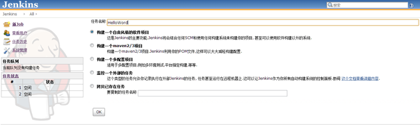 点击新建Job,输入任务名称,如下图,选择构建一个自由风格的软件项目,点击确定按钮,进入Job详细配置界面。